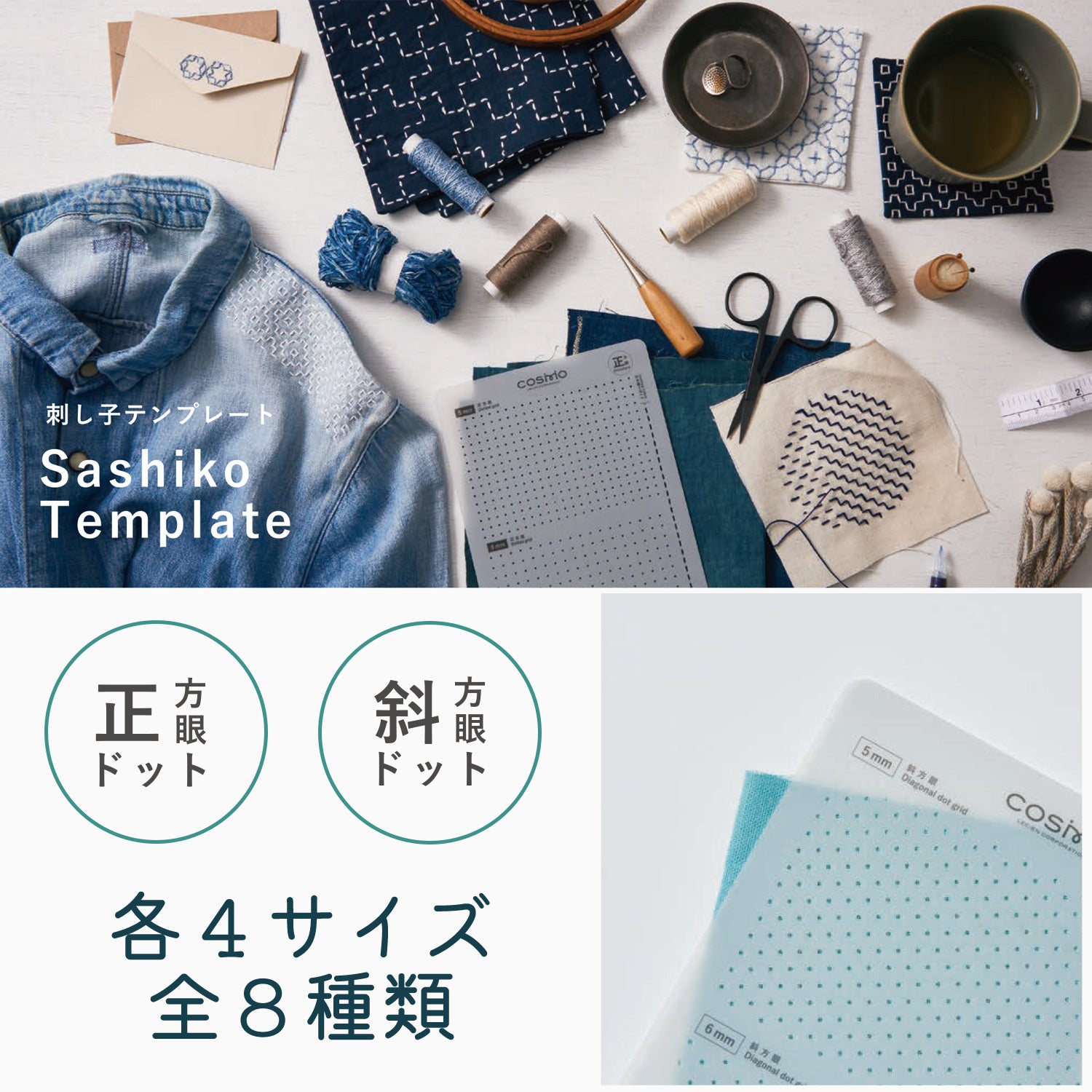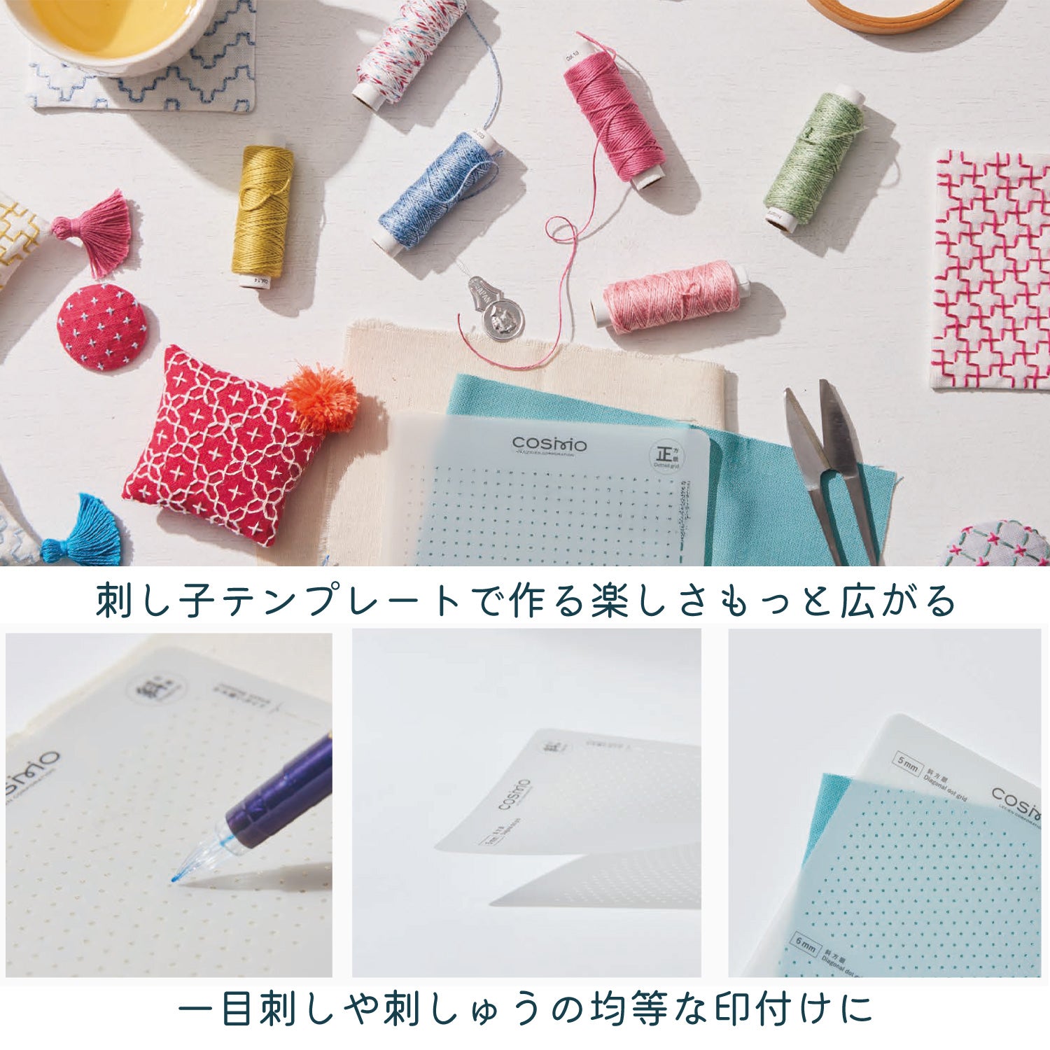- With the Lucien COSMO sashiko template, you can easily create even stitches by simply marking along the holes in the plate.