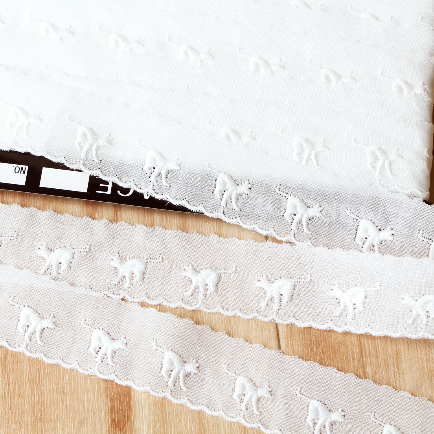 - 腰を上げた愛らしい猫の姿が刺繍された、綿100%のコットンレース