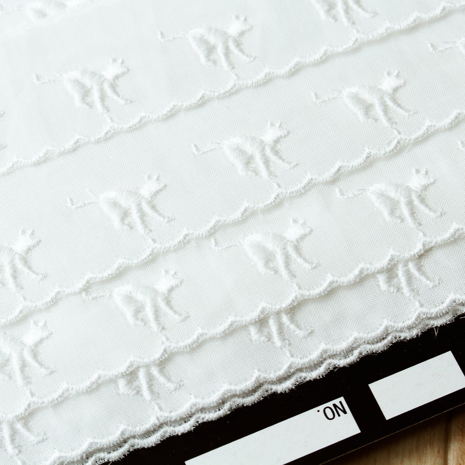 愛らしい猫の刺繍が作品を彩る、綿100%の上質レース