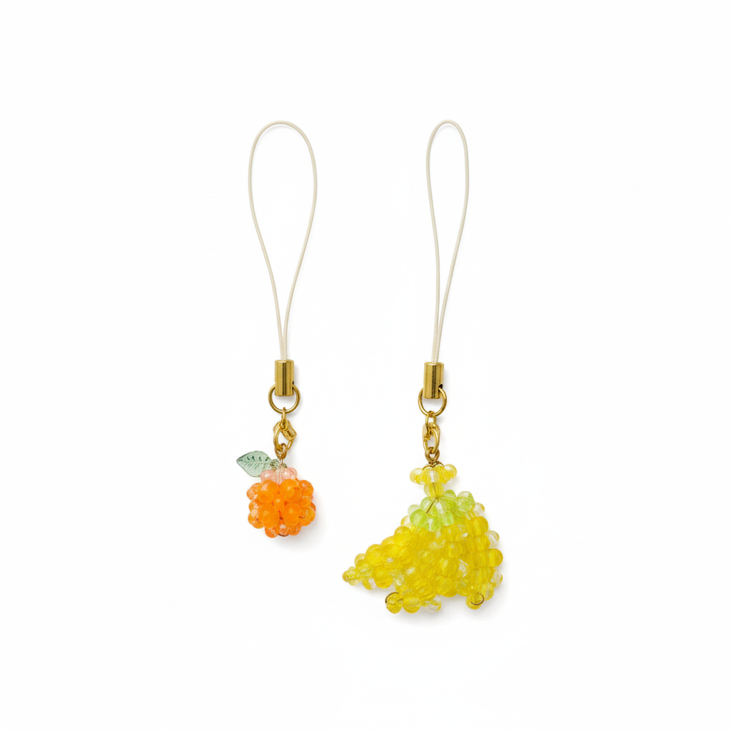 - 「フルーツのストラップキット」で、バナナとオレンジの2種類のフルーツモチーフが作れます