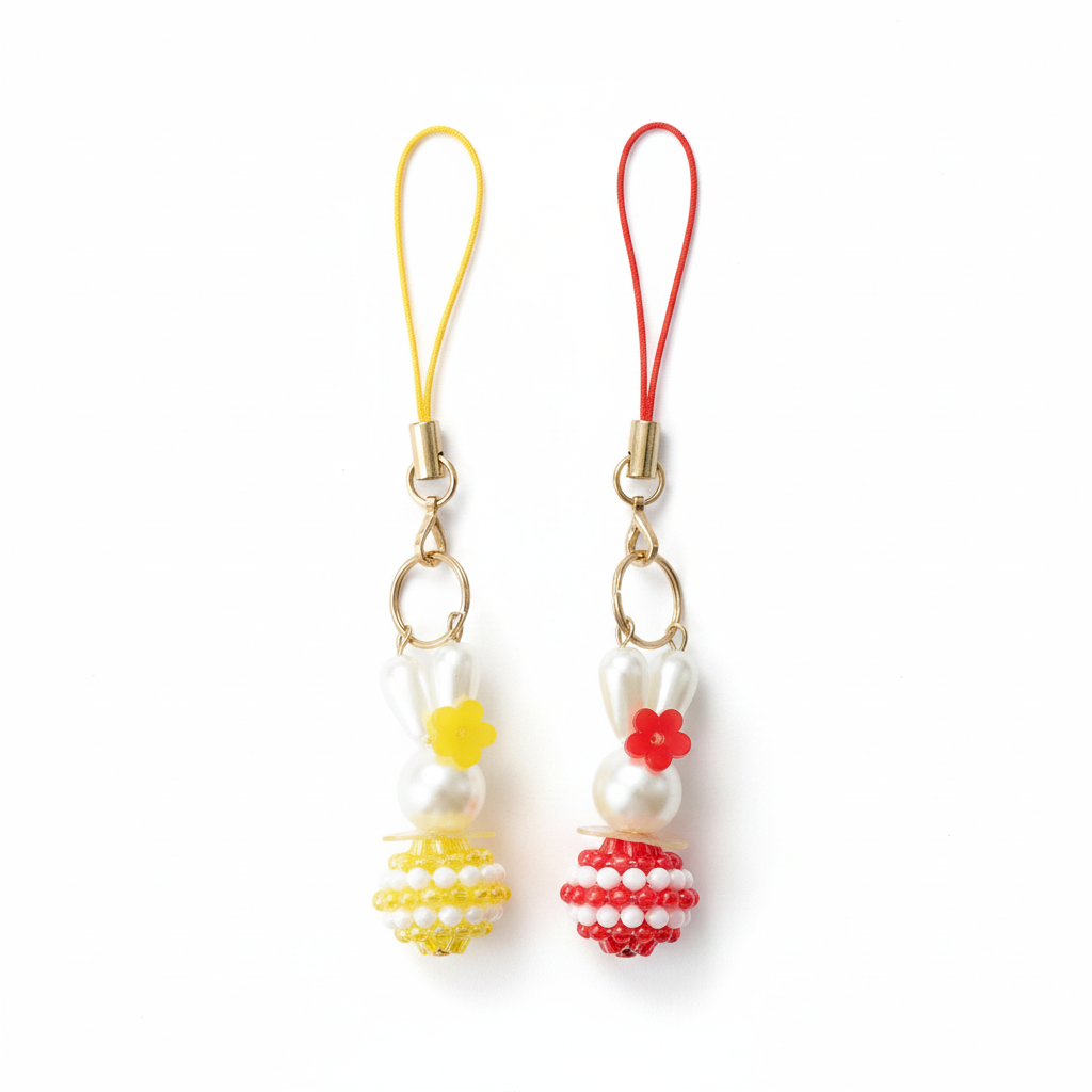 - 「花うさのストラップキット」で、イエローと赤の2色の花うさモチーフが作れます