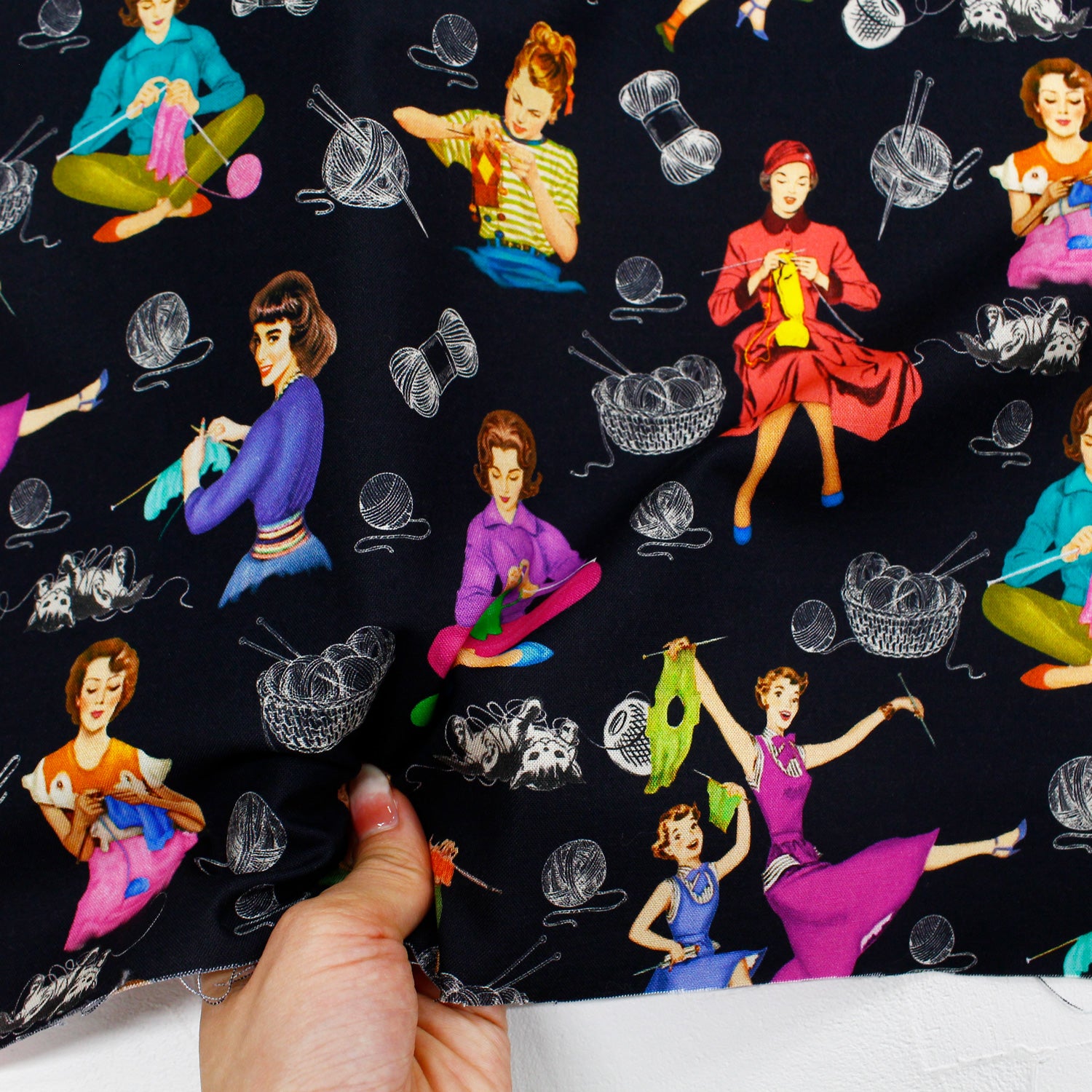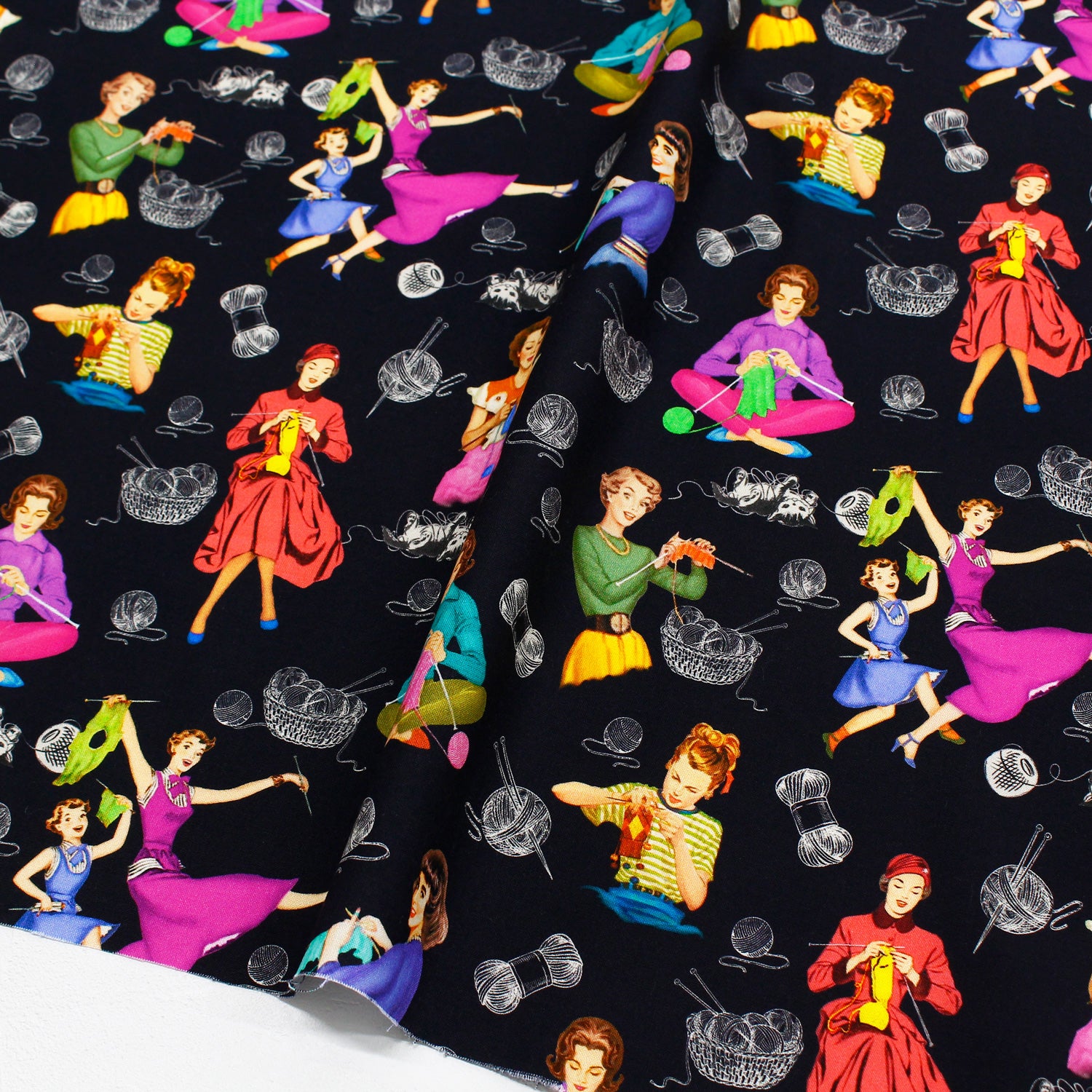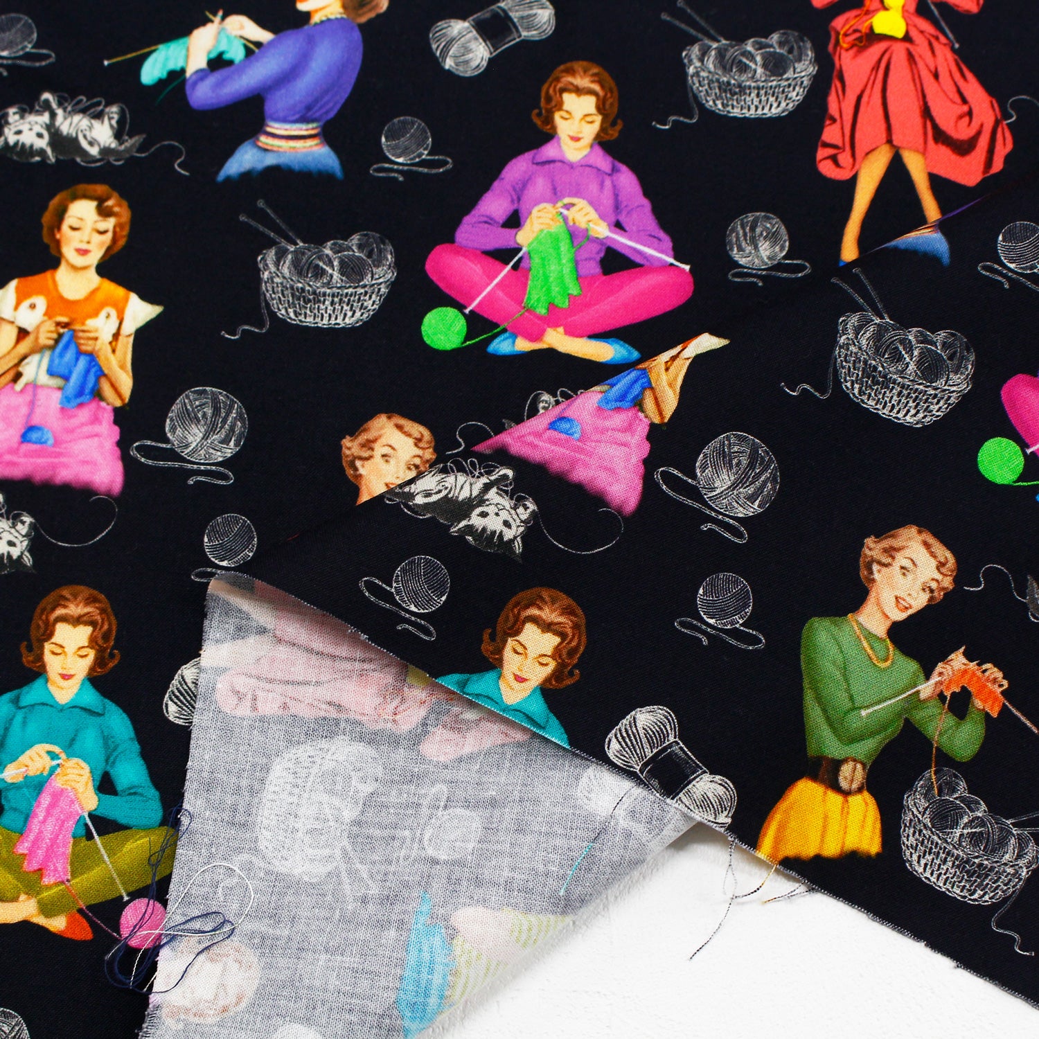 【USAコットン】Michael Miller ニッター レディ 黒地 Knitting time MICH11727-B 綿100% シーチング生地 1mカットクロス