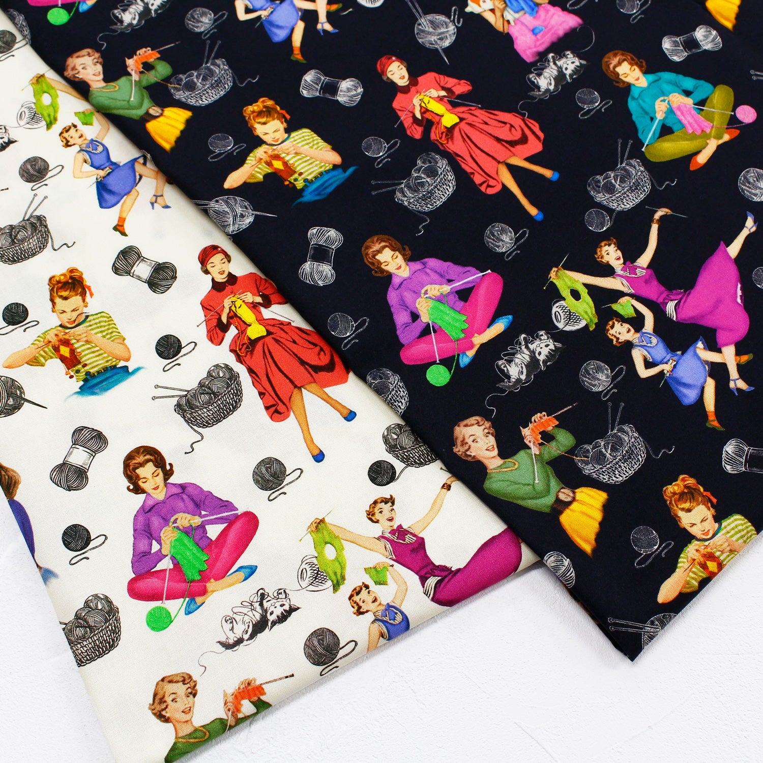 アメリカの人気ファブリックブランド「Michael Miller(マイケルミラー)」のニッター(編み物をする女性)柄プリント生地