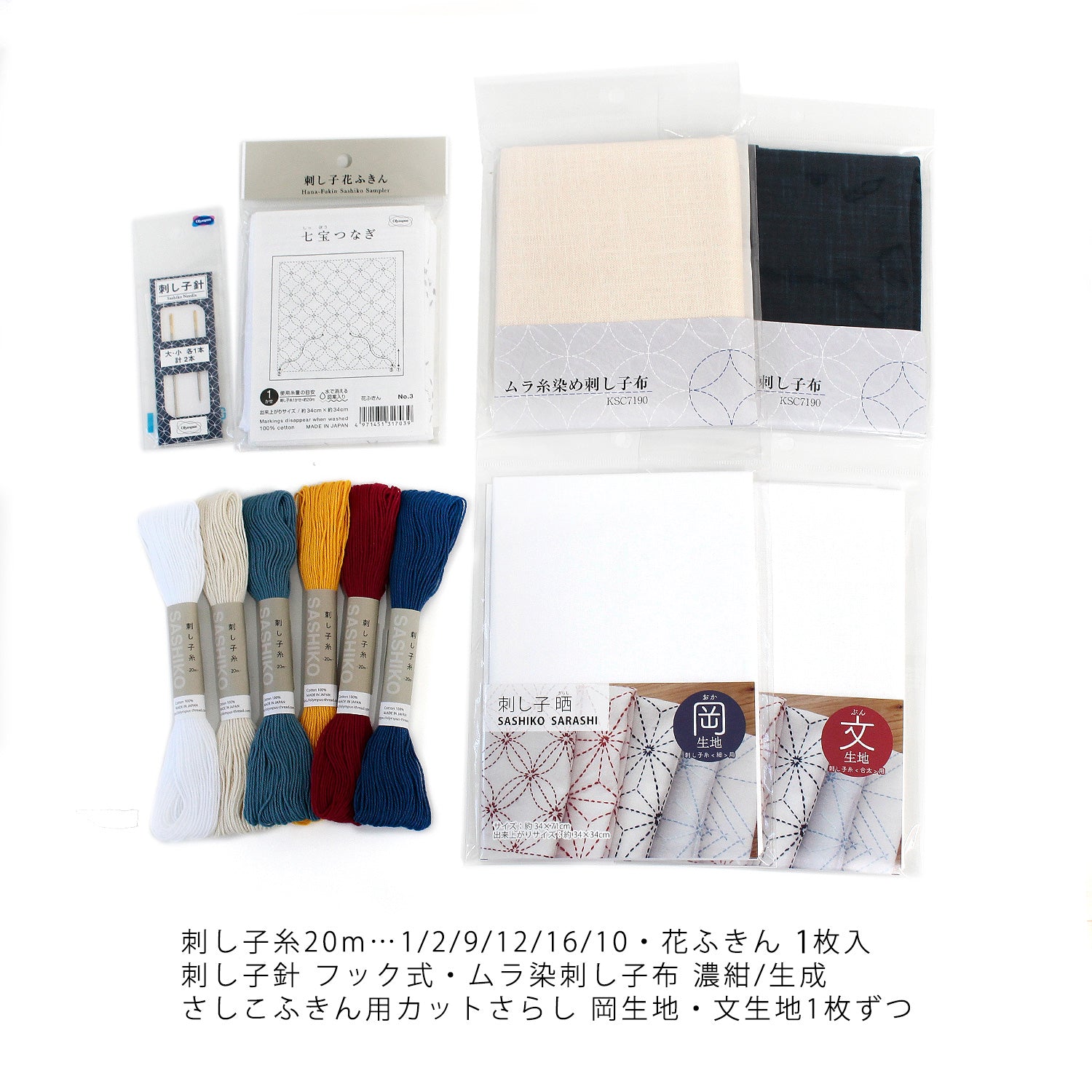 - オリムパスの刺し子糸6色、図案プリント済み花ふきん、フック式刺し子針、ムラ染め刺し子布2枚、さしこふきん用カットさらし2枚が入った充実の12点セット