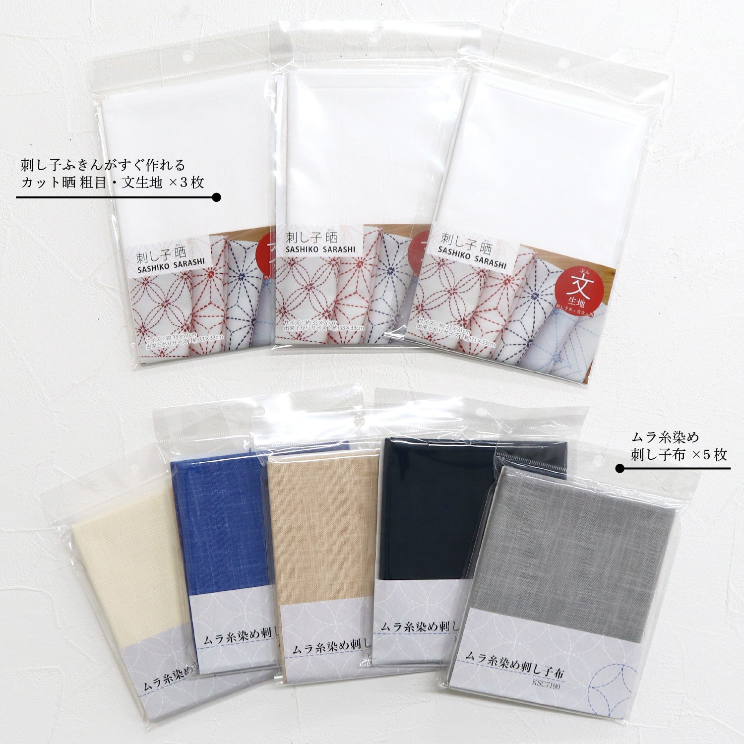 - カット晒(粗目・文生地)3枚、ムラ染め刺し子布5枚、オリムパス刺し子糸24巻、オリムパス刺し子針3枚(1枚につき2本入り)が入った充実の35点セット