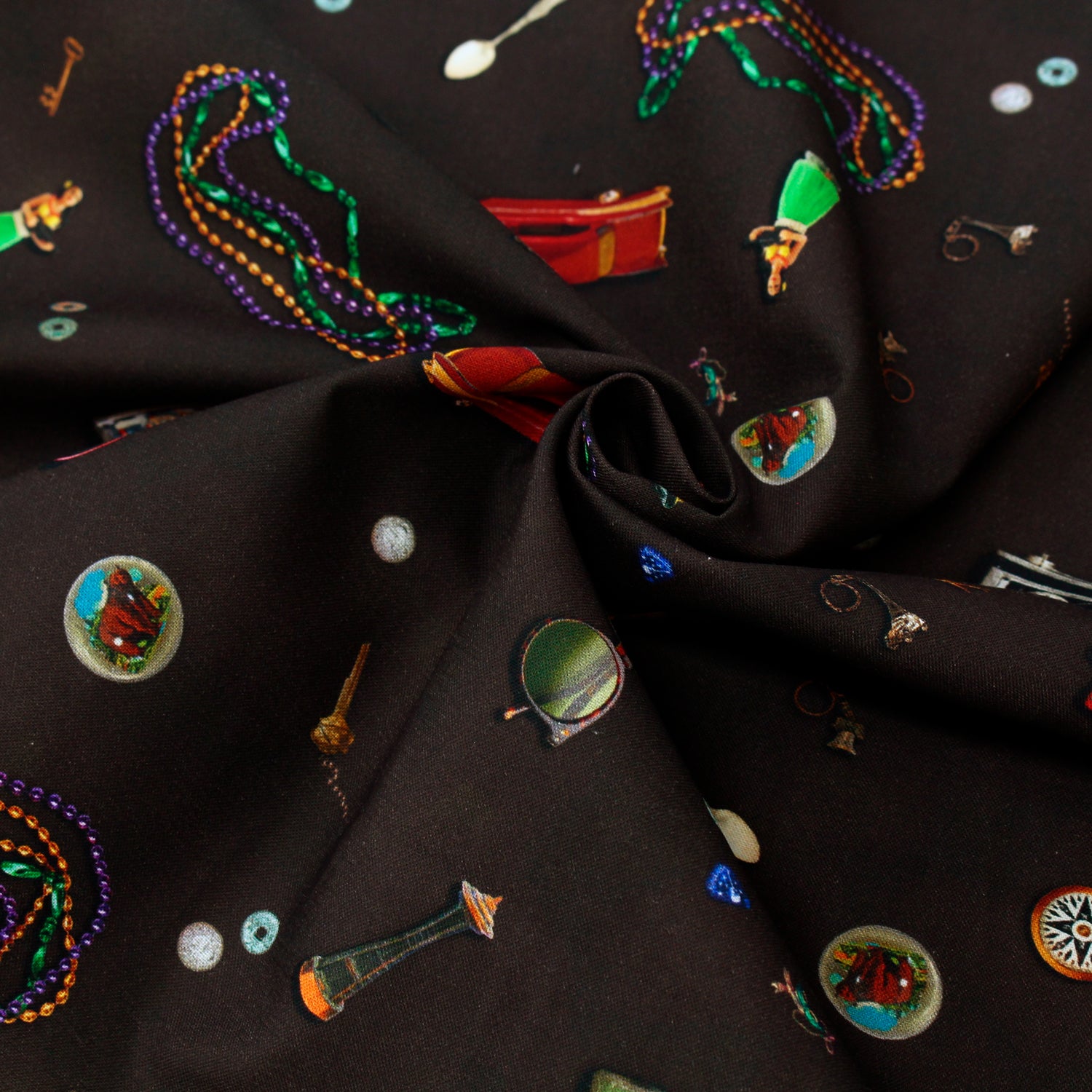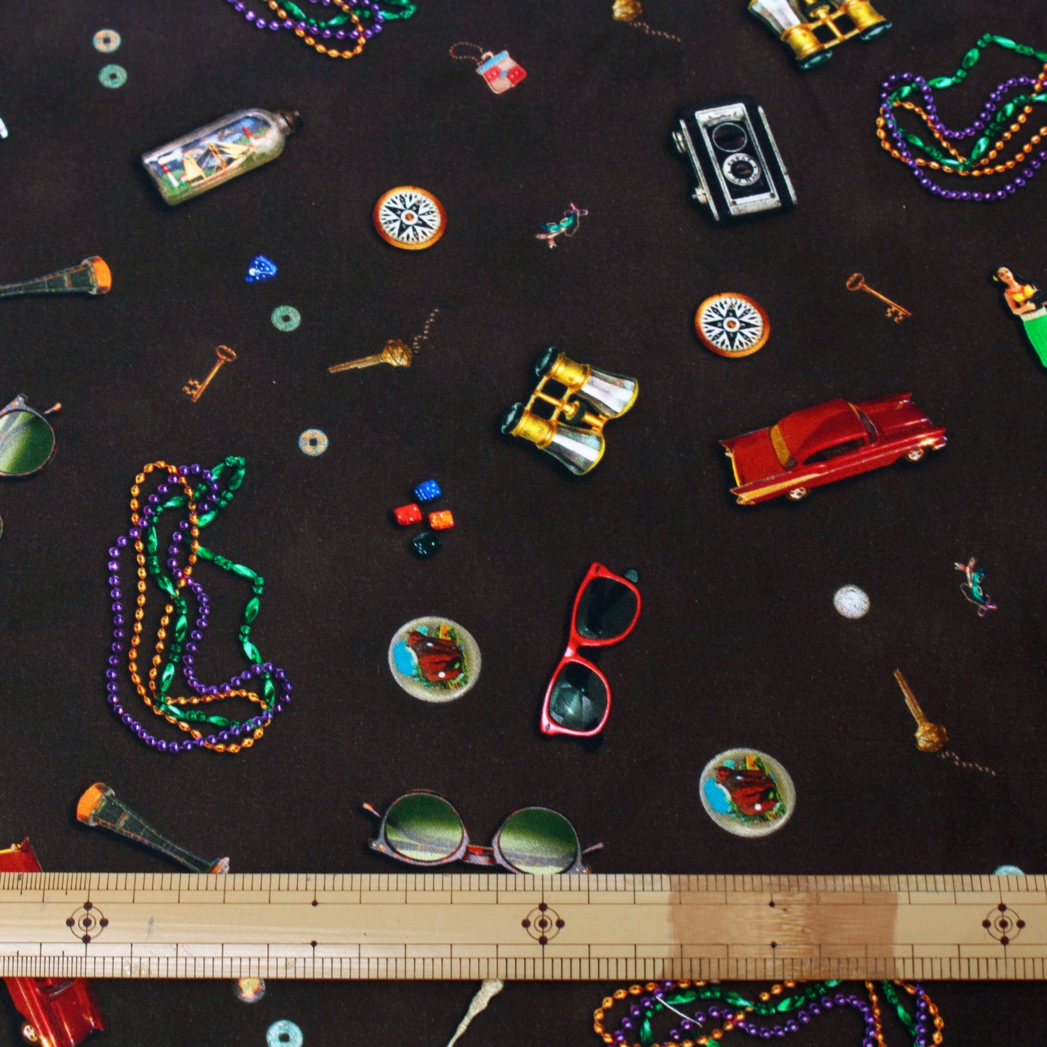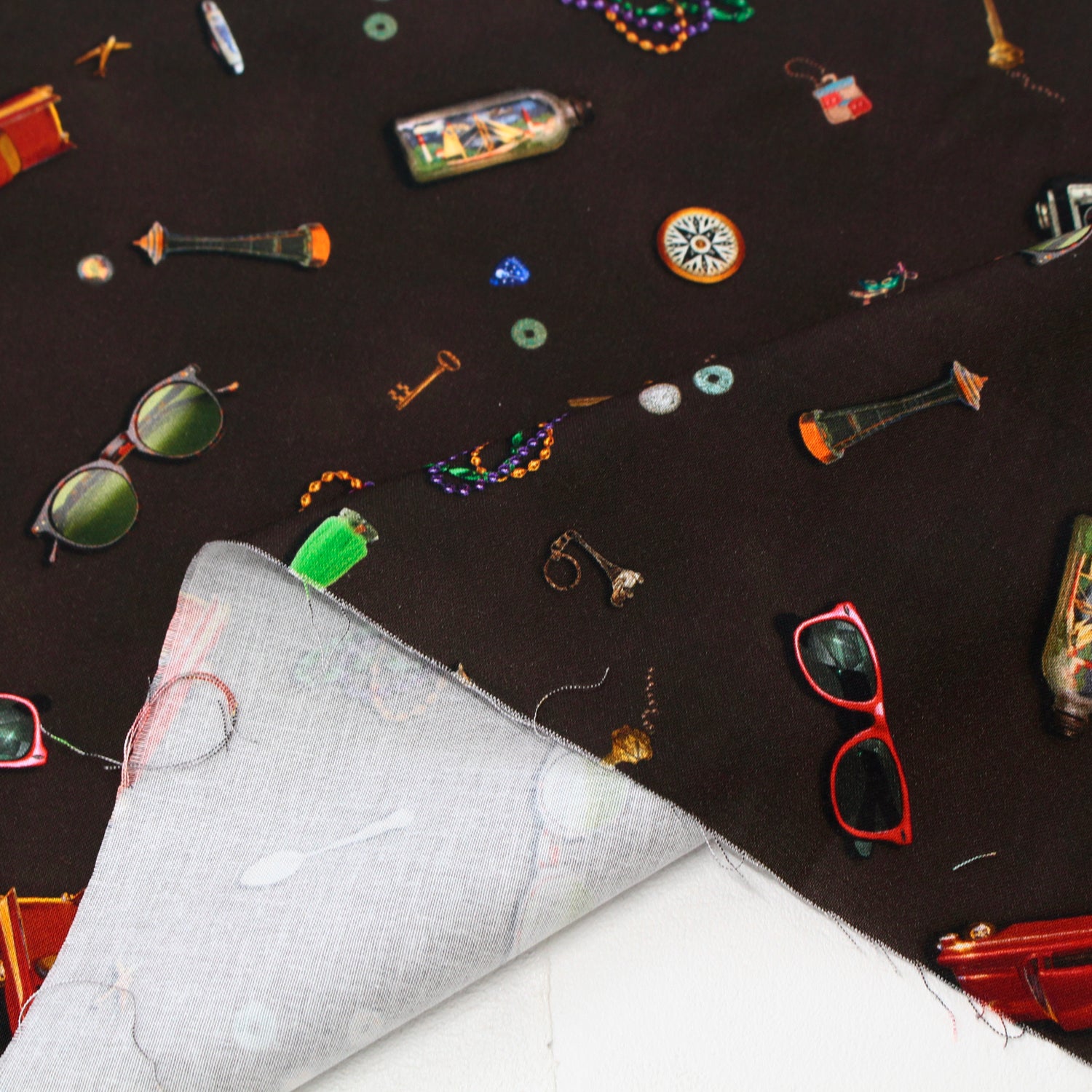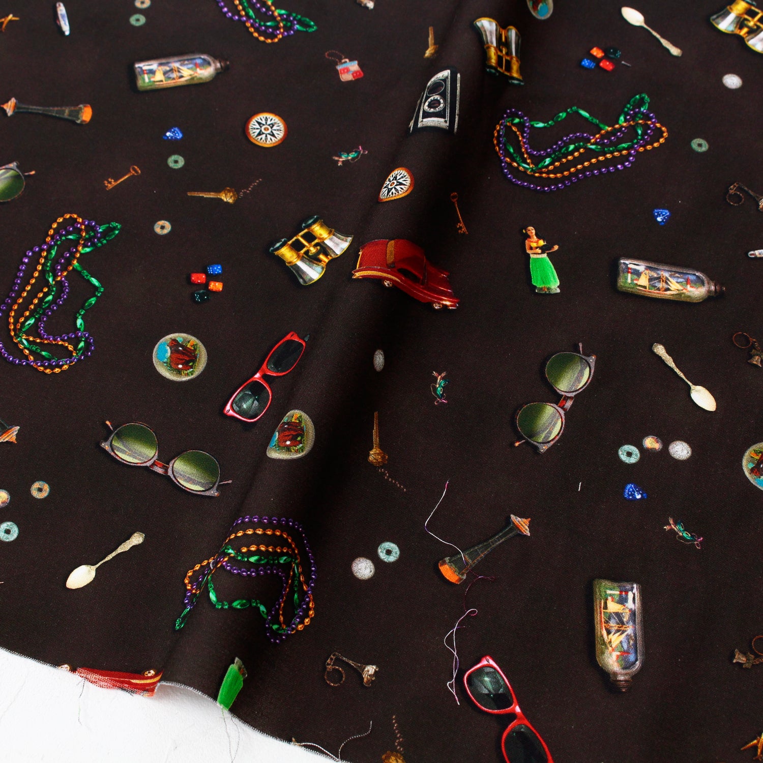 黒地にクラシックなアンティーク雑貨が描かれた、大人シックなデザイン。作品映えしやすく、ハンドメイド作家さんにも人気のUSAコットンです。